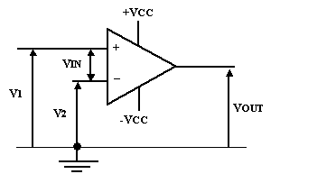 On alimente l'amplificateur avec une tension symétrique ou pas. On applique sur l'entrée non inverseuse une tension V1, et sur l'entrée inverseuse une tension V2. La tension résultante d'entrée, appelée VIN est égale à V1-V2. Cette tension VIN = (V1-V2) est amplifiée par le facteur d'amplification A de l'AOP qui est constant. On la retrouve à la sortie, elle s'appelle VOUT et est égale à VIN x A