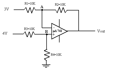 Soit le montage ci-dessous où R1 = R2 = R3 = R4 = 10 K, V1 = 3 V, V2 = 4 V, V3