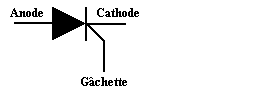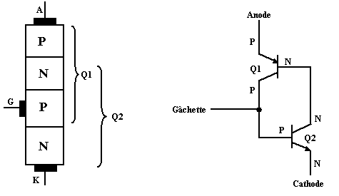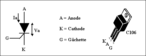 Le SCR consiste en un sandwich de quatre couches de silicium. Le symbole représentatif est celui d'une diode, avec une électrode de commande “GRILLE” ou “G Â C H E T T E”.
