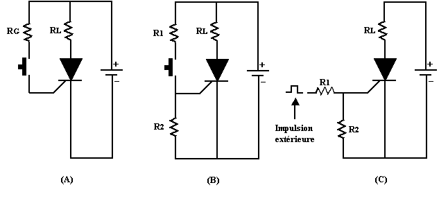 circuit B utilise un diviseur de tension qui applique à la gâchette une