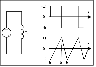 La tension qui alimente la bobine est une onde alternative rectangulaire de forme asymétrique. En t0, la polarité de la tension source vient de s’inverser ; le courant est maximal et négatif. À cause de l’inductance, l’intensité du courant diminue linéairement, passe par zéro, puis croît dans le sens positif. En t1, le générateur inverse ses polarités et applique une forte tension négative à l’inductance. Le courant se met alors à diminuer, passe par zéro puis croît dans le sens négatif. Entre t1 et t2, la pente est plus forte qu’entre t0 et t1 car la tension négative est plus forte que la tension positive. Le courant qui traverse l’inductance a donc la forme d’une dent de scie ; c’est précisément ce genre de courant qui doit alimenter les bobines verticale et horizontale du déflecteur d’un téléviseur.