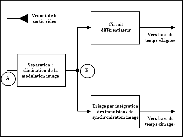 Le signal vidéo complet contient trois informations (signal vidéo ou image, impulsions de noircissement et impulsions de synchronisation), une nous suffit maintenant : celle qui est destinée au déclenchement des bases de temps "trame" et "ligne".