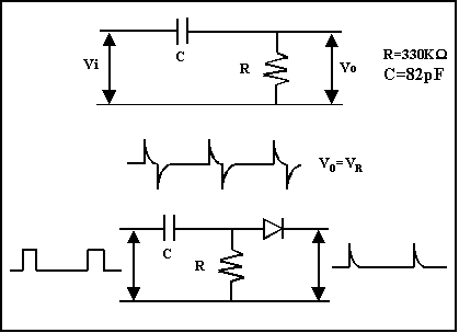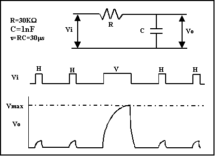 Pour trier les impulsions de synchronisation, on transforme par intégration (filtre passe bas) la différence de durée des impulsions verticale et horizontale en une différence d'amplitude.