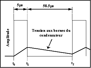 Entre t1 et t2, il s’écoule seulement 4.4 µs et le condensateur perd moins de 13.6 % des charges qu’il avait accumulées entre t0 et t1. En t2, une nouvelle impulsion provoque la charge du condensateur ; sa tension s’accroît jusqu’en t3 où, à nouveau, il se décharge pendant 4.4 µs.