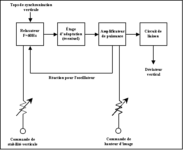 La base de temps verticale commence au relaxateur ou oscillateur vertical. Cet oscillateur génère une sortie qu'il soit synchronisé ou non. La synchronisation verrouille l'oscillateur pour stabiliser la fréquence à 60 Hz.