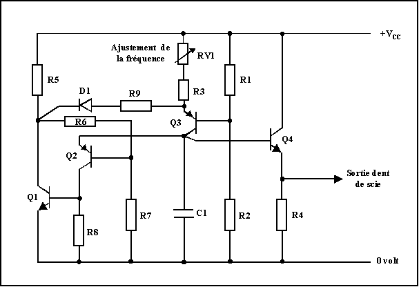 Ce circuit est un générateur qui assure une bonne linéarité des dents de scie au moyen d'une source à courant constant. Il se compose de trois ensembles. Q3 est la source de courant constant qui débite un courant de charge constant à la capacité C1; Q1 et Q2 constituent une porte rapide pour la décharge de C1, Q4 est un émetteur suiveur jouant le rôle d'amplificateur présentant une faible impédance de sortie.