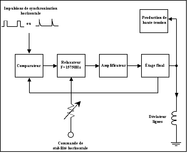 La base de temps horizontale comporte un comparateur de phase qui va fournir une tension de correction continue qui va commander la fréquence de l'oscillateur. Le comparateur est nécessaire car une variation de phase dans les signaux de synchronisation ou dans ceux de l'oscillateur lignes perturbe le balayage de sorte qu'il risque de manquer des lignes dans l'image, l'effet étant analogue à celui des "déchirures".