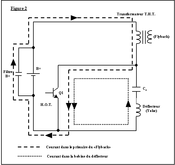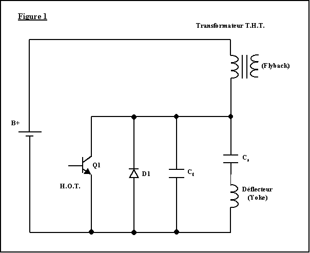 La figure 1 montre un schéma simplifié d'un étage de sortie horizontale avec ses six éléments clés. Le transistor Q1 est polarisé avec une tension B+ qui passe à travers du primaire du transformateur T.H.T. (flyback). Dès qu'il est polarisé, l'étage de sortie horizontale commute entre deux circuits résonants LC. Ces circuits résonants sont formés par le transformateur T.H.T., le déflecteur et les condensateurs de l'étage horizontal.