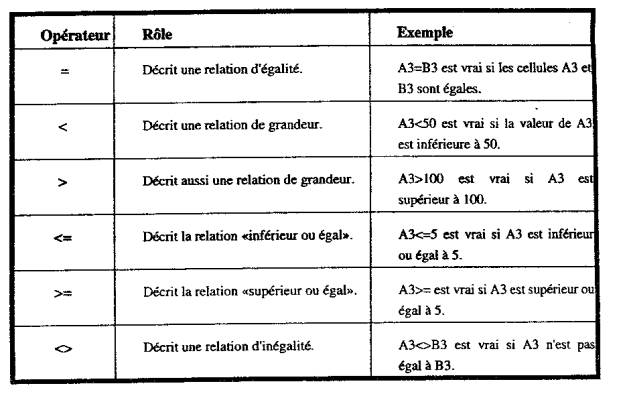 Plusieurs opérateurs sont à notre disposition lorsqu’on détermine une condition. Les fonctions ET, OU, NON, FAUX et VRAI peuvent être utilisées, mais les opérateurs relationnels =, <, >. <=, >= et <> peuvent aussi s'avérer très utiles. Rappelons le rôle de ces opérateurs. Excel évaluera chaque relation de façon logique, en lui donnant une valeur VRAIE ou FAUSSE: