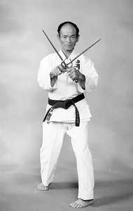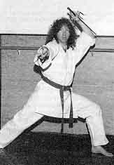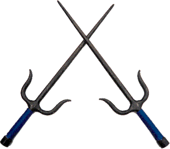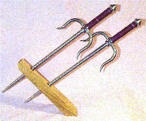 after each training session. The typical design of the sai indicate that it would not stand up to the katana. It was made of too poor a grade of iron, and the short arms are too widely spaced to effectively trap a sword. On the other hand, they are idea for trapping a bo, or an arm. As well as striking, trapping, and piercing, the sai could be used for pinning the opponent by sticking them to the ground. Often 3 sai were carried, one being in the belt so that one could be thrown-typically downward to fix the opponent's foot to the ground-while still leaving 2 sai for use. Also, if you stabbed someone in the chest or leg, the suction as you tried to pull it out would delay you long enough to be in danger. All in all the sai is probably the second most used kobudo weapon. Nunchuks are very popular but illegal in many places. You seldom see sai in competition. Weighing in at 3 pounds a pair, the weight of the weapon mitigates against the flash so popular in modern tournaments. |