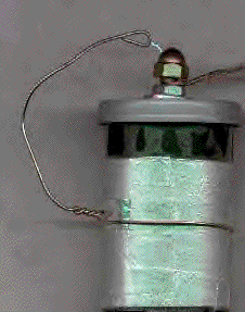 The picture of the film can leyden jar is self explanatory. Now days, a film "can" is really plastic but it is a kind of plastic that makes a great capacitor. The inside foil can be taped to the wall or secured any way you want, so long as it makes good contact with the wall. One person wrote back and reported that the film can exploded as a result of using rubber cement to glue the inside foil to the wall. Rubber cement is highly flammable and explosive and was set off by sparking inside.