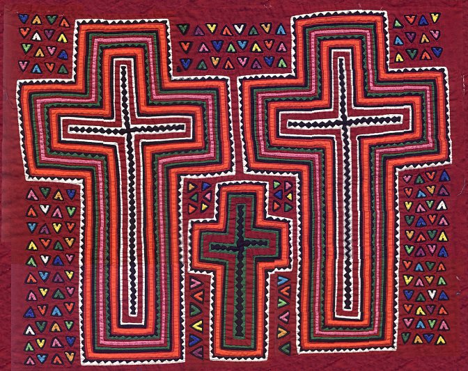 Three Crosses Mola This is a wonderful, oversized mola depicting three crosses. This traditional and very intricate Kuna mola motif is very well executed. The design makes extensive use of the "suidi-suidi" or sawtooth stitch, that is very difficult and "mucho trabajo".. hard work as the Kunas point out. The tiny "v's" in many colors make up the background. The top layer of the mola is maroon, the middle layer is black and the bottom layer is a red "ottomano fabric". The stitches are very tiny and perfectly even. The lines are very thin and even also. It is a spectacular work of textile art. The mola is approximately 5 years old, possibly older judging from the ottomano fabric that was used. It did not receive much wear because it was only used a couple of times a year, probably for religious occasions. The mola is in perfect condition Dimensions: 20" x 16-1/4" SOLD