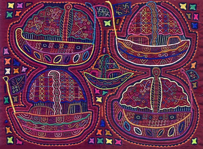 4 Kuna Sailboats This shows four exquisite Kuna sailboats. The Kunas use cayucos or dug-out canoes for their everyday activities. Each one of the sailboats on this mola is different. The top two have the Kuna flag that was used during the Kuna revolution in the mid 20's, I don't know what the two bottom flags represent. The mola is exquisite. The workmanship is superb. It has beautiful embroidered details on each of the sails and the actual boat. The mola maker has used "x" as a background filler. It has three layers of cotton fabric (redish maroon, black & deep pink). The mola is more than 10 years old and is soft from the wear and washings. No fadings or any other defect that I can observe. Dimensions: 16-3/4 " x 13-1/4"