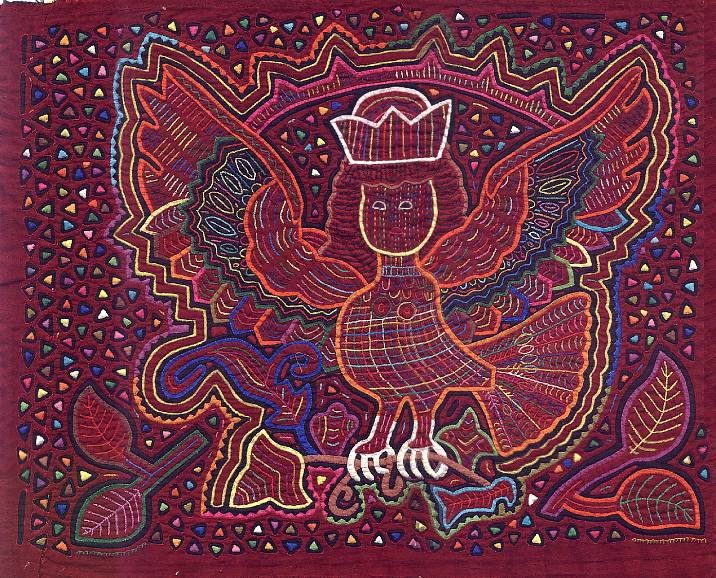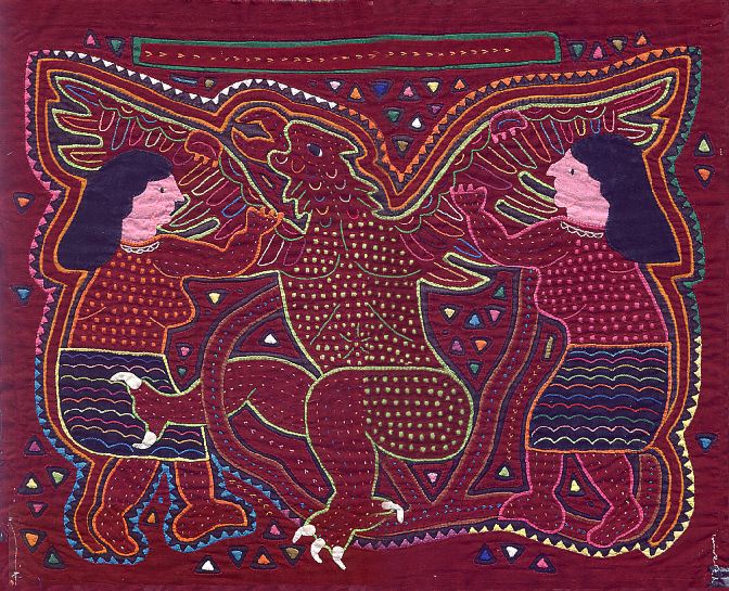 Chimera Mola This fabulous mola is a great example of Kuna mythology. The strange winged creature shown is some kind of a clawed sphynx or chimera - a hybrid being that combines human and animal features. The Kunas believe that evil spirits or "ponis" (also spelled "bonis") were once animals and they can transform back and forth at their whim. According to the husband of the woman that made this mola, this creature is from the fourth layer below the earth. With his dancing, he has seduced the two women in the scene and is taking them back with him. The workmanship of the mola is extraordinary. It has a lot of intricate details and tiny, even stitches. The bodies of the chimera as well as the two Kuna women have the "bua-bua" or tiny cut out squares. The image is outlined in the intricate "suida-suida" or sawtooth stitch. The skirts are enhanced with embroidery and the background has tiny triangles in many colors. Once worn on a blouse of the mola maker. It is between 5 - 10 years old. Excellent condition. Nice and soft from the washings and San Blas sun. The image does not do the mola justice! It is really a one of a kind. Dimensions: 16-3/8" x 13-1/4"
