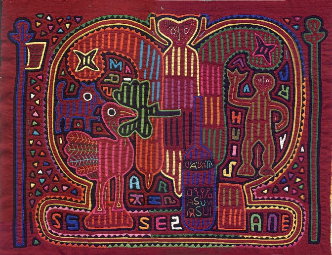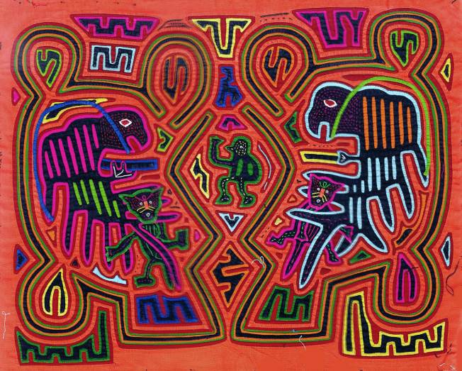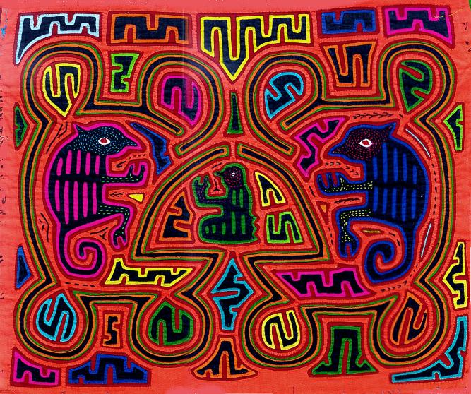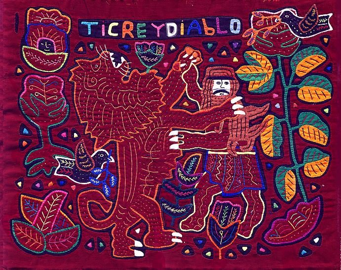 Tigre y Diablo This is a very peculiar mola that the mola maker has labeled "Ticre y Diablo", she probably meant to write "Tigre y Diablo" referring to a devil and the proud looking lion that she has confused with a tiger! The motif for this mola was more than likely inspired by a storybook. I tend to lean towards Beauty and the Beast or maybe the Wizard of Oz or maybe one of the hundreds of other stories. We do have a majestic looking lion (probably was once a prince) dancing in a garden with a long haired humanoid creature with claws. The Kuna designs are inspired by many sources. One of their favorites is from storybooks, comic books, greeting cards and any other printed matter. These are copied and often adapted to meet the Kuna woman's fancy. This mola is approximately 15 years or older.The top layer of the mola is maroon, the bottom layer is black. The mola maker has added another layer of fabric on the bottom to give it more weight. She has used other colors between the maroon and black layers, mainly orange and other smaller pieces. The mola is soft from the wear and the washings but shows very little fading. Dimensions: 16-1/2" x 13" |