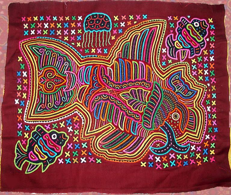 Magnificent Under Water Scene Mola This fabulous mola is a real work of art! It shows a very colorful huge fish swimming in the depths of the ocean. The fish appears to have something in it's mouth, probably a fishing hook. With the large fish are two smaller ones and a jellyfish. The mola is exquiste. The workmanship is of the highest quality. It is made in the reverse applique technique and has superb embroidery details that enhance the design. The stitching is very tiny, almost invisible, and very even. The lines are narrow and uniform. For the background the Kuna artist used little "x's" in many colors, adding liveliness to her design. She used three layers of fabric: maroon, black and a mustard yellow (not as bright as it looks on the digital image) and other swatches of fabric in between these layers. The mola is in mint condition. It was sold to me before the mola maker had the opportunity to wear it. I've had it for about three years in my personal collection. Dimensions: 18" x 15" SOLD |