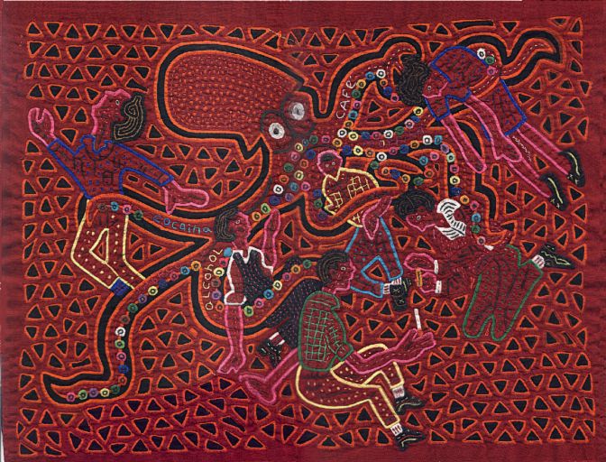 Rare "The Perils of Drugs" Mola This is an extraordinary mola that conveys a message. It shows an octopus that has caught many youths in his tentacles. The octopus represents the different vices: cocaine, marihuana, tabacco, alcohol even coffee. There are already several caught, and the mola maker has represented them with looks of anguish. A couple of young boys seem to be experimenting with what may be a cigarette or marihuana and the octopus has his eyes on them to catch them as well. A very interesting "protest" mola. The design may have come from the mola maker's imagination or even from a pamphlet or book that she might have come across. The mola is excellently made. The whole background is filled with triangles in reverse applique in the same colors as the main layers of fabric, so as to not detract from the message that the Kuna woman wants to convey. The head of the octopus has tiny cut out squares and the tentacles have colored applications. She has used embroidery for details on the children's faces and clothing. The stitching is small and even. A very "collectible" mola. It is approximately 8 years old and has been worn quite a bit but is in very good condition. No stains, or holes or fading. The image shows fading but it is because of the scan, not the mola. Dimensions: 17-1/4" x 12-3/4"