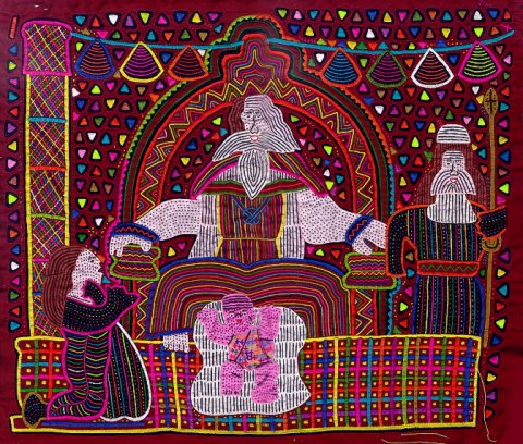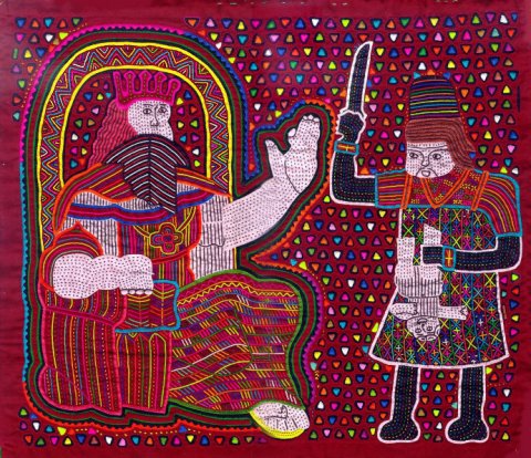 Religious Mola Pair (OLD Testament) King Salomon! Note: Thanks to Margaret that corrected me on the interpretation of this Mola. I had it as King Herod killing the innocent children, but it's actually KING SALOMON! Salomon, the wise King, that asked the Lord for knowledge is sitting at his ornate throne in his magnificent palace while a guard stands by. The Old Testament story says that two women were fighting over a child, both claiming to be the child's mother. They went to King Salomon so that he would decide the fate of the child and the wise King said that the child should be cut in half so that each mother could have 1/2 of the child. The real mother cried "No" and answered that she preferred to give the child up before anything should happen to the child. Then King Salomon realized that this woman was the real mother, and of course, the child was spared and given to her. In the top mola we have Salomon sitting on his throne and ordering the guard to cut the child in half! In the bottom mola we have the mother pleading for the life of her child and Salomon acknowleding that she is the true mother. The molas are fabulous. The Kuna artist that stitched these molas did a superb job. They are very intricate. with extraordinary details. Sewn in the reverse applique technique with very tiny and even stitches. The molas are enhanced with embroidery details throughout the mola. The mola maker has added hundreds of tiny colored triangles as a background filler. The suidi-suidi (saw-tooth stitch) that surrounds Salomon's throne in both molas is very neat and uniform. The carpet at the foot of the throne has the tiny cut out circles and very thin strips of fabric criss-crossing the circles. Both of these have been worn on the mola-maker's blouse. Made between 1990 - 1995.