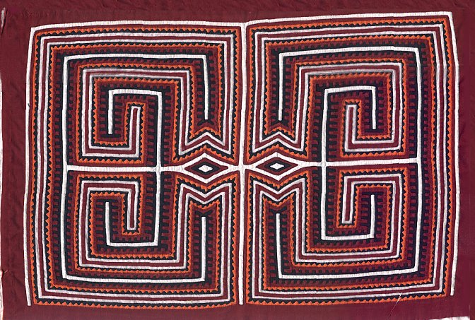 Exquisite Traditional "Path" or Igar Mola This is another Sergan design that has been interpreted by the mola maker representing one of the "Path" chants that the Kuna saylas (shamans) use in their rituals. They have the chant of Muu for childbirth, the chant of the Hermit Crab (Galu Igar) which is a popular motif, the prayers to the Kuna's God.. or Path to the Father (Bab Igar).... and many more. They represent the path that the spirits or "purbas" take in order to carry out the mission for which they are invoked. This "Igar" or Path is a wonderful design and the workmanship is "out of this world". It has the suidi suidi or sawtooth stitch throughout the mola and another stitch that is similar to the sawtooth that resembles the teeth of a comb or "peine" stitch. It has four layers of fabric: Maroon, orange, black and a white base or bottom layer. The stitches are very tiny, practically invisible, and very neat and even on both the front and back of the mola. It is an outstanding work of art. SOLD