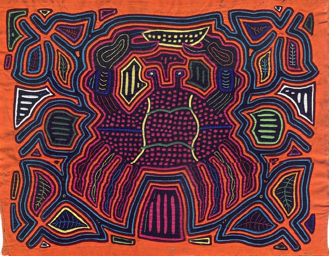 Clever Crabs Mola Pair This is an exquisite pair of molas of superior quality. They depict a pair of crabs and show the ingenuity and cleverness of the mola maker as well as her excellent workmanship. The top mola shows the crab looking us straight in the eyes, as if he were walking towards us on the beach of Kuna Yala. This was the front panel of the blouse. As the Kuna woman walked towards someone, the crab would be facing him. (It took me a few minutes to see it right!) The bottom mola, worn on the back panel of the mola maker's blouse, shows us a beautiful crab but seen from a different perspective. Here we are looking down on him. He seems to be busy having his lunch. Both are superbly made in reverse applique. The stitches are tiny and even and almost invisible. The bodies are made with the little cut out squares, permitting the smaller swatches of bright colored fabric to show thru. The legs and claws, as well as the leaf like patterns used as fillers, have touches of embroidery. As background fillers the mola maker has used little abstract - reverse applique designs. The lines are thin and very even. This clever pair of molas were worn on the blouse of the Kuna artist that made them. They are approximately 5 years old. Please Note: The scans don't do justice to these fine works of ethnic art. The molas had to be scanned in six different sections and it was very difficult to match them up properly. The lines and blurs on the images are a result of my limited scanning capabilities! Dimensions: 18-1/4" x 14-1/4"