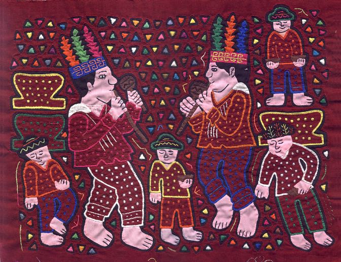 "Kantules" Mola Pair This is a superb pair of molas that portray Kuna culture and traditions. These represent the "Inna Feast" or puberty ceremony, which is perhaps the most important Kuna ritual having remained almost "intact" throughout the centuries. The Kantules (derived from "Kama Tule", man of whistle or flute) are the leaders in the ceremony. "Chanting to the spirit of his long cane flute, he guides parallel activities in the spirit world and describes every step of the ceremony in ritualized, formal language." (The Art of Being Kuna, Salvador, p. 212 ) In the top mola, two Kantules are leading the purberty ritual. The Kuna artist has paid attention to every detail and included the variety of ritual elements in her design. Everything from the fancy hat made with feathers and a basket weave design; the pelican bone necklace; the cane flute to the gourd rattles (Maracas - sp./ Koke -rattle, Nasis -gourd in Kuna) and the "tules" or Kuna people that have already had too much to drink have been represented. The puberty ceremony lasts for days... until the "chicha" (fermented corn drink) runs out. In the bottom mola, the ceremony is almost over. The Kantules, still playing their flute, are now resting in a hammock... undoubtedly the feast will continue tomorrow... The beautifully decorated containers large near the top is were the "chicha" is stored. The "sianala" or clay braziers are burning "cocoa beans" . The molas are excellently made. The mola artist has used a variety of stitches, including the "pua-pua" or tiny cut out squares. The stitches are tiny and even. Little colored triangles are used as filler elements. These molas are BRAND NEW, they have never been worn, even though they were intended to be. Dimensions: 16" x 12-1/4"