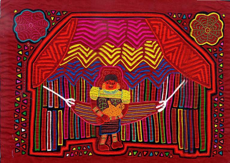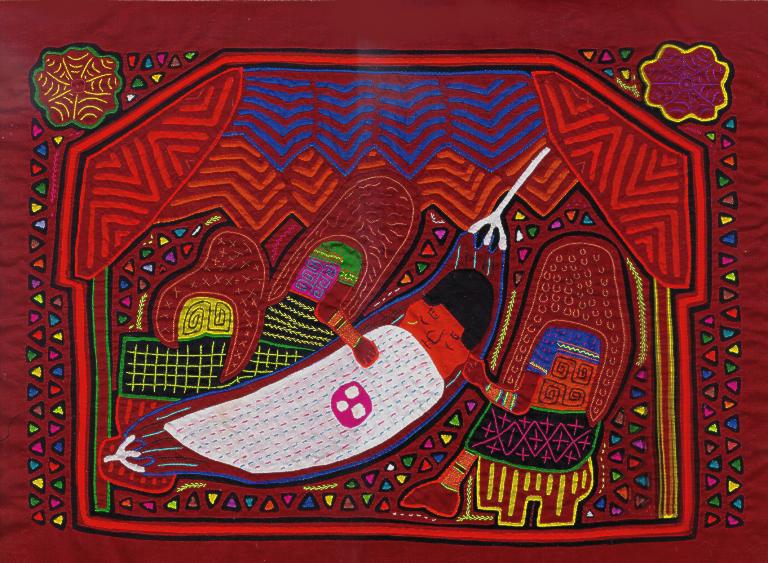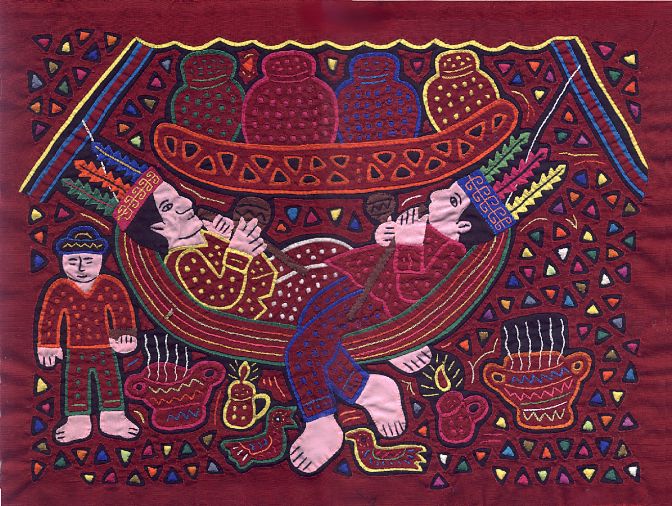 Kuna Village Life - Hammocks - Birth & Death - Mola Pair These are brand new molas, originally made for a blouse but I was lucky to get them to offer to you before they were actually worn on the garment. The top panel is a Kuna mother holding her baby, rocking him or her in a hammock inside the Kuna dwelling. The bottom pannel is a Kuna wake. The deceased indian is in the hammock inside the Kuna dwelling and the three Kuna women, with their arms and legs bands and their mola blouses and head scarfs, are mourning him. They are called "lloronas" or cryers in Spanish.
