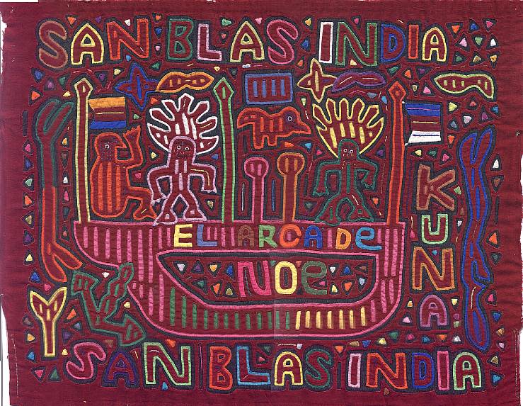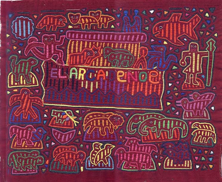 Outstanding Vintage "Arca de Noe" Mola Pair This great pair of old molas is a wonderful example of the Kuna woman's sense of humor and creativity. The mola is approximately 20 years old or more. Probably from the late 1970's. Here we have Two "Arcas de Noe" or Noah's Ark. The top mola, however, does not refer to the reading from the Bible but rather to an old Colombian Trading Boat by that name that made many trips to the San Blas Islands to barter their goods. At the top left of the boat is the flag of Colombia. There is another flag at the rear of the vessel which I can't identify. On the "Arca de Noe" are three people, two of which are presumed to be Kuna Indians and the other is probably the Colombian Captain. The lettering of "San Blas India" on the top and the bottom and Kuna on the right were probably used as filler elements and also used by the mola maker to identify her origin. The bottom mola is the traditional "Arca de Noe" or Noah's Ark and here we have Noah with his staff and many animals in pairs. Elephants, tigeres, monkeys birds etc... are identifiable. This Ark also has it's name in colorful letters. This is a remarkable pair of molas and in excellent condition. It is very rare to see molas this old in such excellent shape. The molas are all sewn in the reverse applique technique. Embroidery is only used in some cases on the animals eyes. They have the "tas-tas" or vertical cut outs and lots of tiny triangles add liveliness to the background. The mola maker used the "Ottomano" fabric on the base layer of the mola. This fabric is no longer made, or at least not availaable anywhere in Panama or in Colombia (they tell me). This is a fabulous pair of collectibles! Dimensions: 17-1/4" x 13-3/4" SOLD