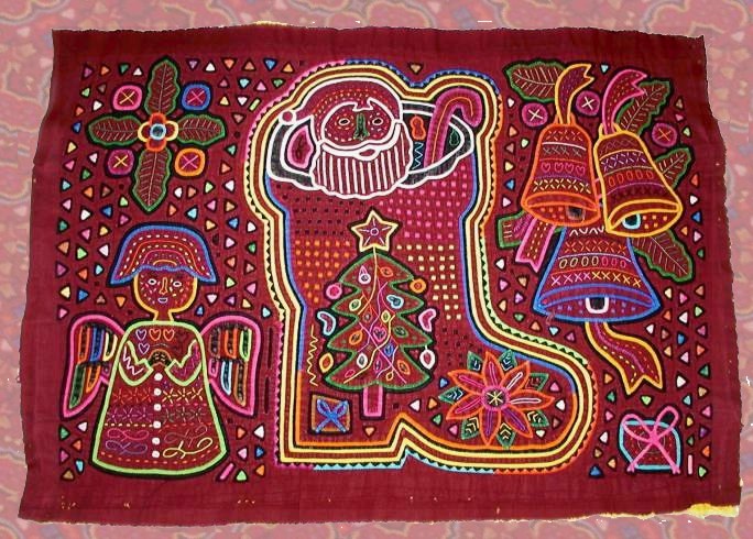 Extraordinary! Santa Claus in his Boot Mola With Christmas coming up real soon, I considered it appropriate to offer this Santa from my personal collection. It's one of my very favorite Santa Molas and the best that I've come across during my years of mola collecting. This is a very lovely mola of top quality workmanship that shows Santa coming out of his Boot! The boot is adorned with a lovely Christmas tree and a Pointsettia. To continue the theme the Kuna artist added lovely bells and a little angel. The workmanship on this mola is faboulous! The boot has been filled with tiny cut out squares in different colors. The boot is outlined in the intricaate and very difficult sawtooth stitch (suidi-suidi).. it is very even and the points are all the same size! She used beautiful embroidery details on the angels and the bells as well as the pointsettia. It is a true work of art. The top layer is maroon (it looks a bit redder in this image), the middle layer is black and the bottom or base layer is yellow. Many smaller swatches of fabric, in different colors were inserted between these layers, adding color and beauty to the design. The mola is about 10 years old. It is in wonderful condition! No stains, rips, cuts, fading etc... Dimensions: 18-3/4" x 13-1/4"