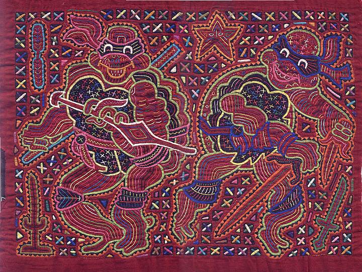 Exquisite - Vintage - Teenage Mutant Ninja Turtles Mola This is a fabulous mola from about 1987 - 1988. It depicts two of the Teenage Mutant Ninja Turtles, probably Leonardo the leader, and maybe Micahelangelo (?) during one of their many battles. The mola is remarkably detailed. The craftsmanship is magnificent and every single space in the mola is filled. The stitches are practically invisible. The Kuna artist used a variety of stitches for her creation including the "suidi-suidi" (suidamakalet) or sawtooth stitch, beautiful embroidery and hundreds of little "x's" throughout the mola. This top quality mola was obviously a favorite of the Kuna mola maker and is in excellent condition considering it's age and the wear. It is slightly but nicely faded, It has one small tear on the edge (see picture) but it doesn't detract from the mola at all. The mola is made from three full layers of fabric. The bottom fabric is the "Ottomano" fabric that was originally purchased from the Colombian traders and is no longer available. This mola is a great collectible. As Leonardo would say: "GO FOR IT". It measures 16-3/4" x 12-1/2" SOLD . |