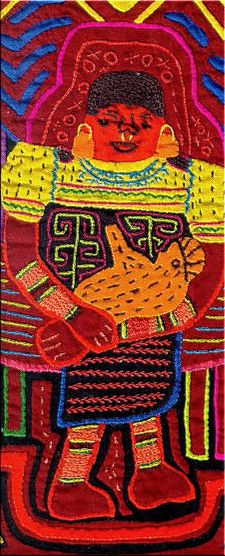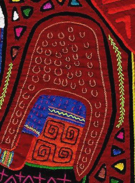 This mola is one of a pair that portrays Kuna Village customs. Here we have three Kuna women, outfitted in their Kuna dresses, mourning a Kuna man that lies dead in a hammock. Hammocks are a integral part of the Kuna culture. Babies are rocked to sleep in them, the Sailas or tribe leaders lay in them during their ceremonies, the sick are cured in them, the dead are mourned and then carried away in them for burial. The dwelling here represents a Kuna house or hut. The roof is thatched with palm tree fronds. This is represented by different colored swatches of fabric between the main fabric layers and hand stitched in the reverse applique. The embroidery on the Kuna women's clothing is exquisite. Please scroll down to see the details. The blur on the image is not on the mola but as a result of the scan. Wonderful and elaborate embroidery throughout the mola. The background is filled with tiny colored triangles. This was made to be worn on a blouse but was not ever used. Brand New - Mint condition. Size: 18" x 14". Colors: Top layer Maroon, Middle layer Black and Bottom layer Maroon. Mola Maker = Martina of Ustupu |