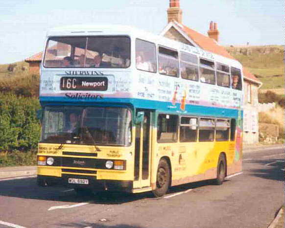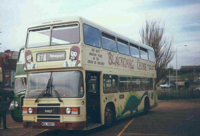 vents replaced with non-opening fixed glass in: In April 1986 WDL693Y [693] was repainted into a beige Colorbus advertisement for "Blackgang Chine". In June 1988 WDL695Y [695] received a wrap-around advertisement for "Plumb Centre". In August 1988 WDL692Y [692] was repainted into a Yellow & Blue Colorbus advertisement for "Lions Club of Ryde". In October 1989 WDL694Y [694] was withdrawn. Three
