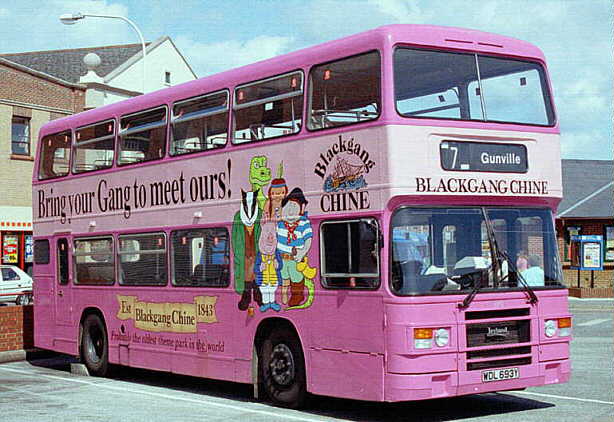 & Cream livery in: By August 1993 WDL693Y [693] had been repainted into a pink Colorbus advertisement for "Blackgang Chine". Around the autumn of 1994 WDL692Y [692] / WDL693Y [693] / WDL695Y [695] & WDL696Y [696] were converted to DPH40/30F by having the bus seats replaced with coach-style seats. [per Buses magazine, December 1994] In 1995 WDL695Y [695] was repainted into Mushroom & Dark Blue (roof & skirt) livery with a wrap-around advertisement for the IW Council unitary authority. The