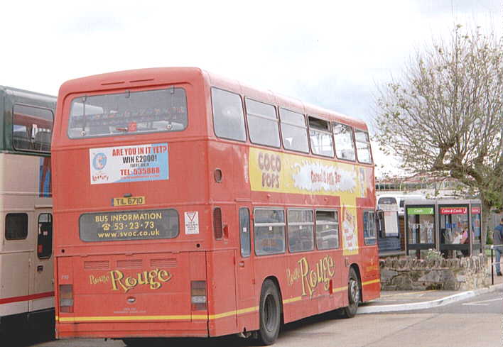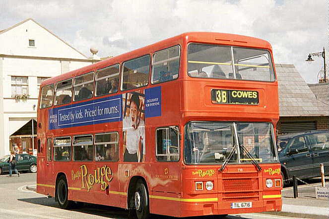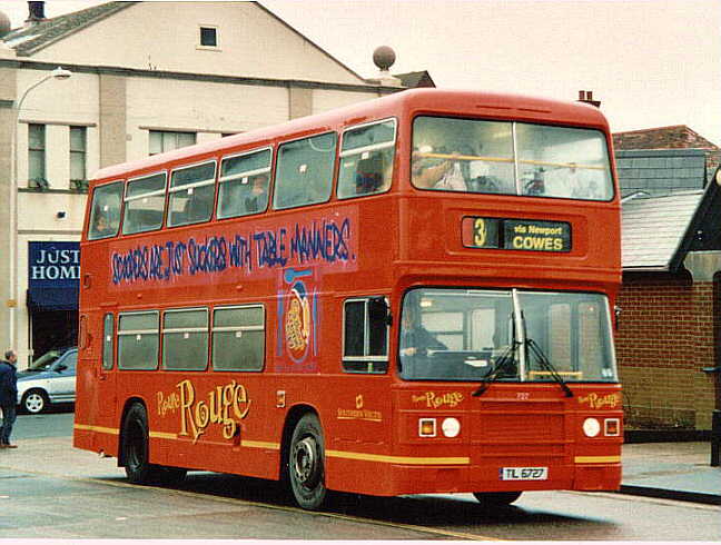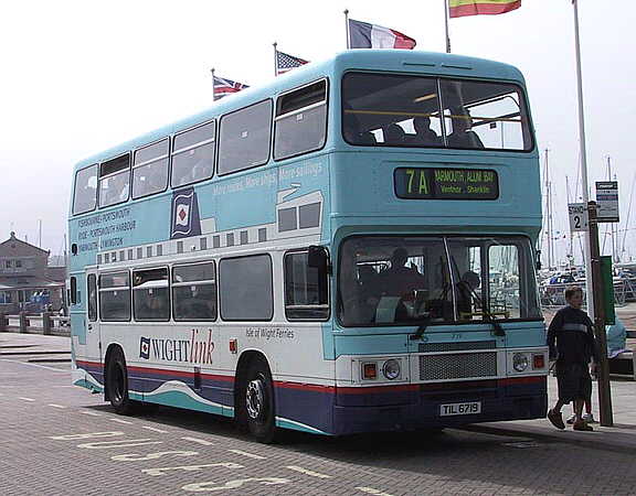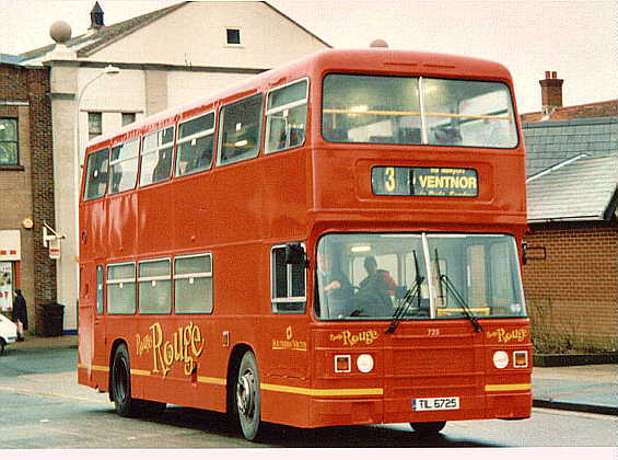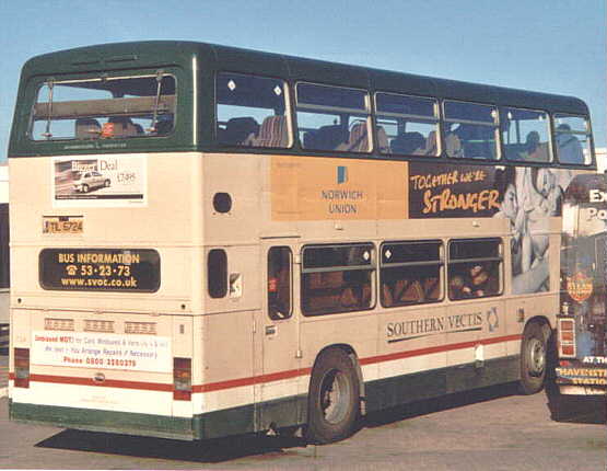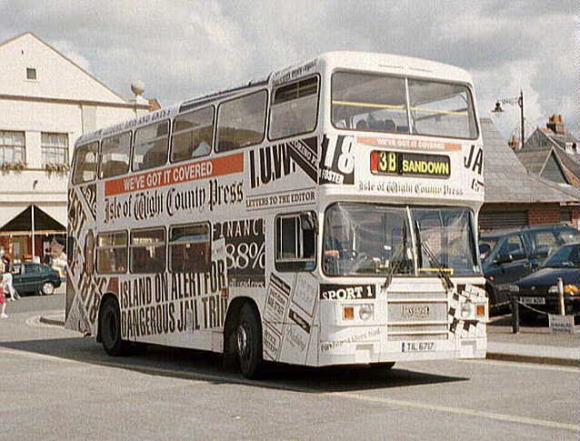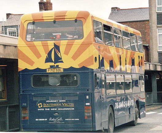 Green livery: In May 1996 G719WDL [719] was repainted into a Colorbus advertisement for "Wightlink" ferries. In September 1996 G717WDL [717] was repainted into a Colorbus advertisement for the "Isle of Wight County Press". At some stage the first window of G718WDL on the nearside lower-deck was converted to an opening type instead of the fixed glass type in which it was supplied new, whereas the last window on the offside of the lower-deck was converted to fixed-glass type. During February 1998 G725XDL [725] was stolen, overnight, from Ryde Depot and having been driven around the town it finally came to grief by being crashed into a front garden wall. This was the second such incident within three months, N810PDL having similarly been stolen and vandalised in December 1997 from Newport Depot. In October 1999 F712SDL [712] was repainted into a special "Millenium" livery consisting of a Yellow & Orange upper deck and dark blue lower deck. At the same time the rear Registration Index Plate was repositioned centrally above the lower-deck rear window (it was previously offset to the nearside). During the winter of 1999/2000 G727XDL [727] was fitted with an opening window on the second window along on the nearside of the lower-deck, following damage sustained when it was stolen from Newport Depot and crashed. On 13 November 2000 the entire batch was reregistered thus: