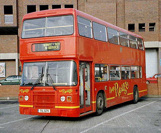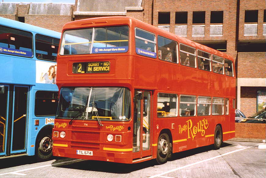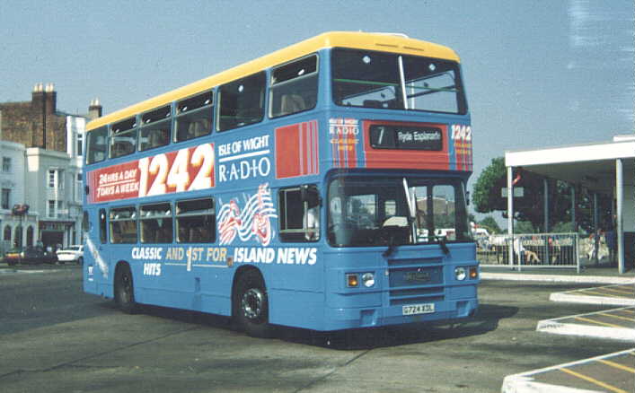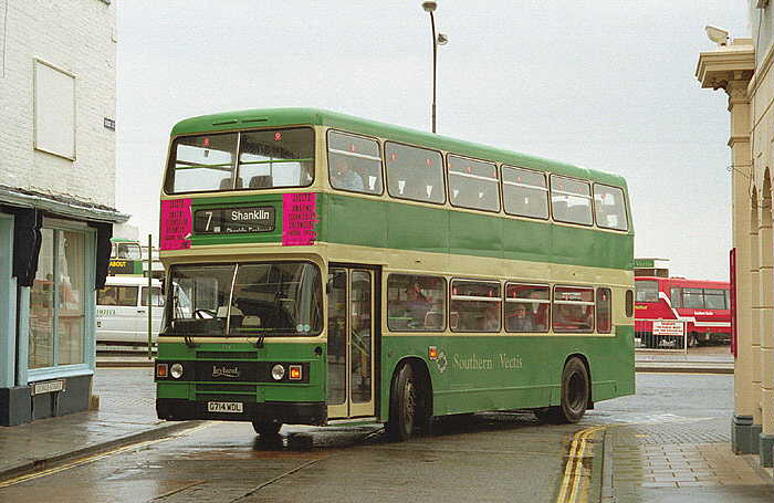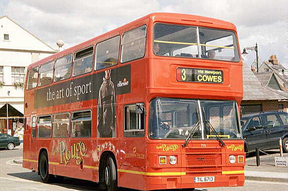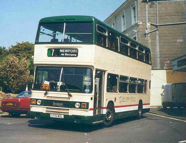 buses to be supplied equipped with coach seating. Three were delivered during May/June 1989: F710SDL [710] / F711SDL [711] & F712SDL [712]. The coach seating in this batch to the offside in the upper-deck were arranged back-to-back in bays. F710SDL [710] & F711SDL [711] were actually delivered as F701RDL & F702RDL respectively but were altered before entering service. Eight were delivered during September/October 1989: G713WDL [713] / G714WDL [714] / G715WDL [715] / G716WDL [716] / G717WDL [717] / G718WDL [718] / G719WDL [719] & G720WDL [720]. The coach seating in this batch all faced forward unlike batch delivered in May/June 1989. Five were delivered during May 1990: G723XDL [723] / G724XDL [724] / G725XDL [725] / G726XDL [726] & G727XDL [727]. They were identical to the batch delivered during September/October 1989 except that the second window along on the nearside of the upper-deck is of the opening type (whereas 710-720 were fitted with fixed glass) and the second window along on the nearside of the lower-deck is of fixed glass (whereas 710-720 were fitted with the opening type). In April 1990 F712SDL [712] received a UniBus advertisement for "Brickfields Equestrian Centre". Between 1992 and 1995 G724XDL [724] was repainted into a Colorbus advertisement for "Isle of Wight Radio" (Blue with Yellow Roof and white lettering on red background). During early 1993 F711SDL [711] was repainted into the 1993 Island Explorer Cream & Dark Green livery, being the first vehicle to carry this livery. Around 1994 the seating of F710SDL [710] / F711SDL [711] & F712SDL [712] was re-arranged to DPH41/29F. Around the autumn of 1994 the seating of G713WDL [713] / G714WDL [714] / G715WDL [715] / G716WDL [716] / G717WDL [717] / G718WDL [718] / G719WDL [719] / G720WDL [720] / G723XDL [723] / G724XDL [724] / G725XDL [725] / G726XDL [726] & G727XDL [727] was rearranged to DPH41/29F, in that the offside of the upper-deck seating was arranged in bays with some seats facing rearward (similar to the batch delivered in May/June 1989). [per Buses magazine / Gavin Rowney] Several