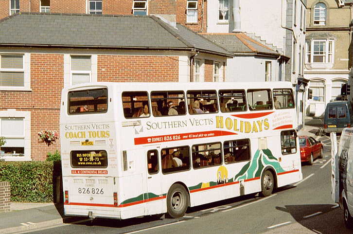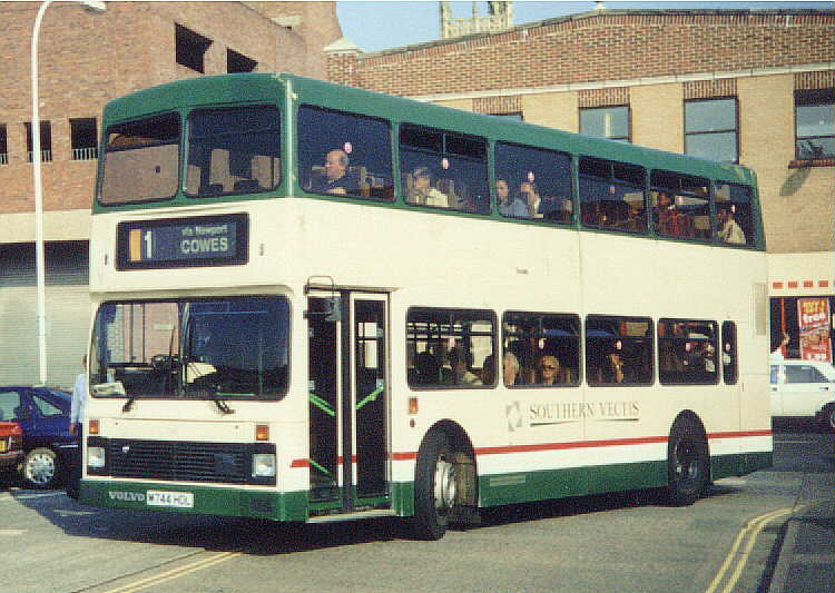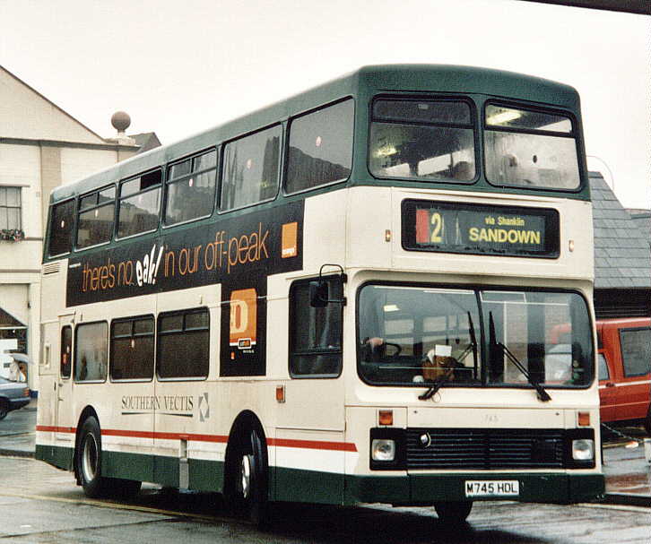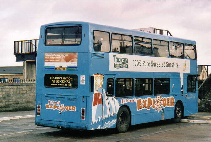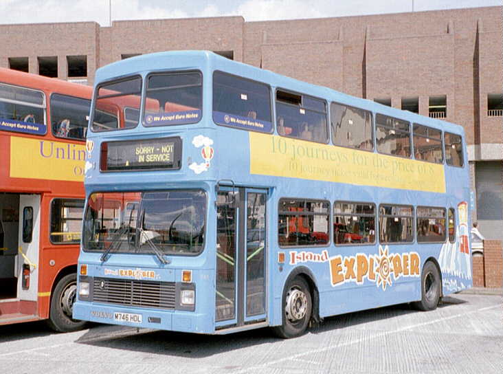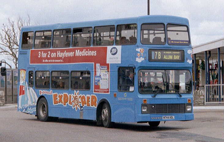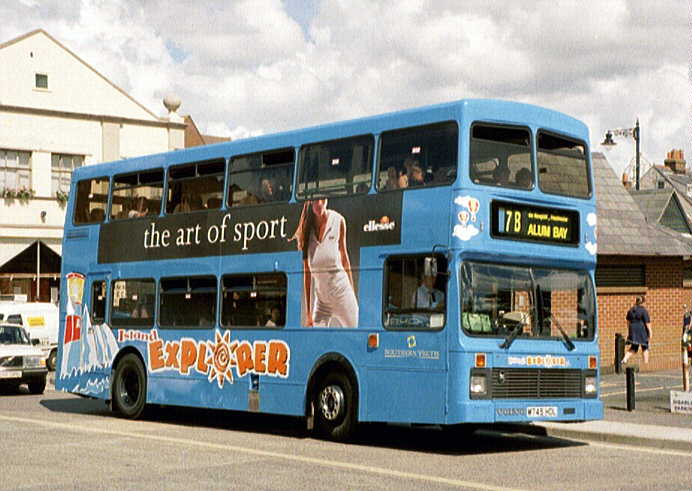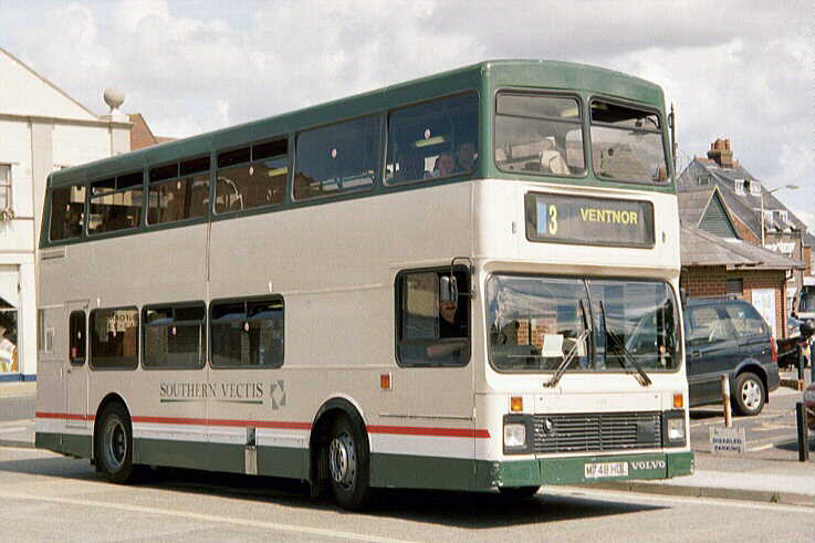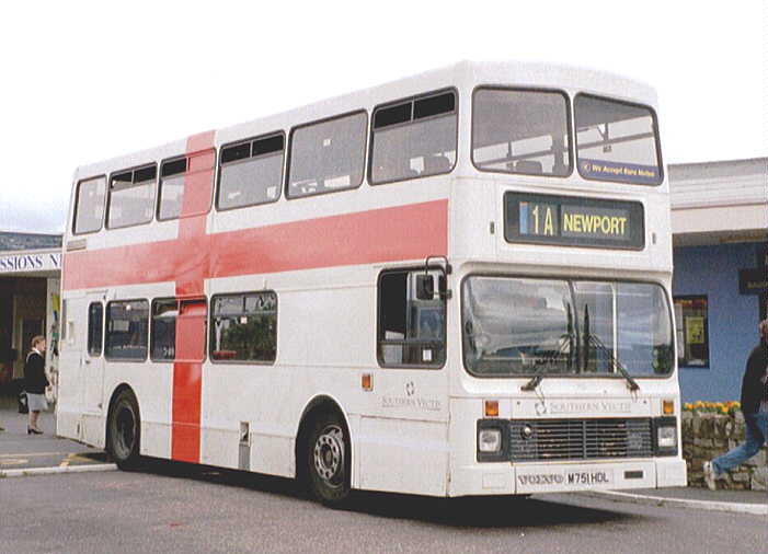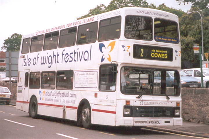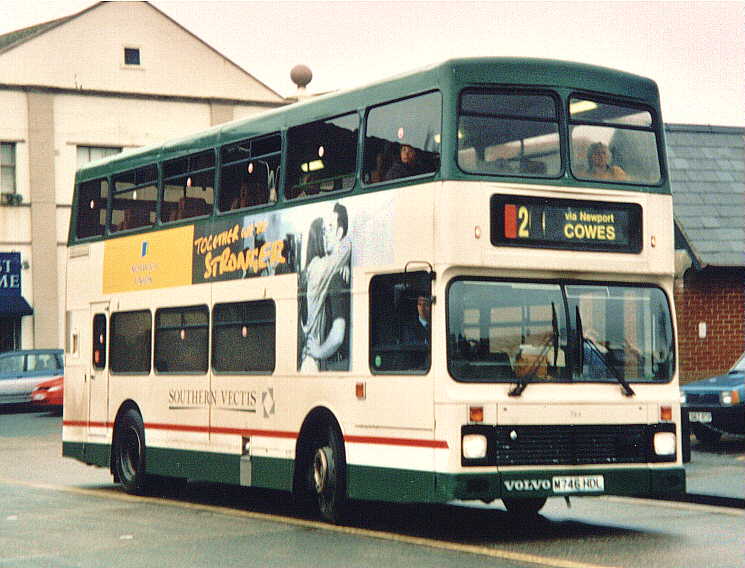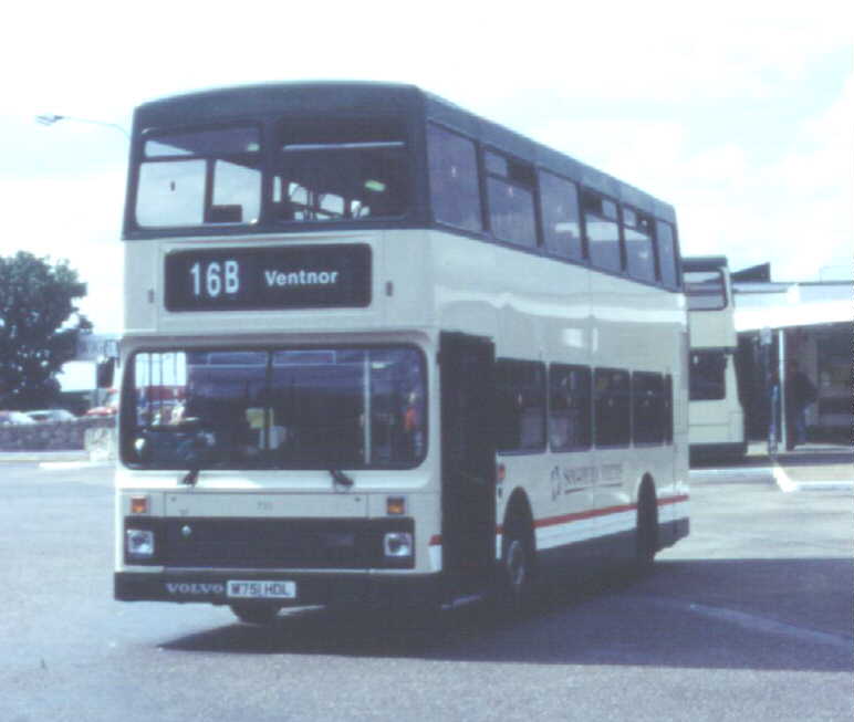 with coach seating. The Volvo Olympian's were similar in appearance to the Leyland Olympian's delivered in 1993 although the upper-deck front windows have an inverted 'V' type appearance at the roof and, at the rear, the lower deck window is larger. They also feature revised engine cooling ventilation grilles. There was never a [747] because M747HDL was a reserved registration mark with the DVLA. [per Ian Rivett] Around 1996/97 M745HDL [745] carried no VOLVO badge (which is normally placed to the offside of the front licence plate) following accident damage sustained in Shanklin. This was re-instated, probably during April 2001. In 1998 M751HDL [751] was converted to coach standard. It was painted all-over White with vinyls for "Sun Island Holidays", being used for private hire and mainland coach duties. A special trailer was purchased (to carry passenger luggage), which was painted in matching livery, and towed by [751] whilst on the mainland workings. M750HDL [750] was also fitted with a towbar as a backup vehicle. Internally M751HDL [751] was stripped of virtually all of the grabrails, tables were fitted in the bays of the upper deck offside and curtains were fitted to the window bays. Subsequently, the upper-deck front windows were replaced with non-opening fixed glass. On 29 November 1998, the tables and curtains were removed, but the grabrails were not reinstated, and M751HDL [751] returned to passenger duties. [per Gavin Rowney] In March 2000 M751HDL [751] was repainted into a White Colorbus advertisement for "Southern Vectis Holidays". During