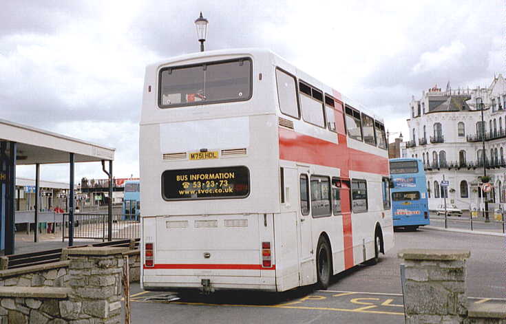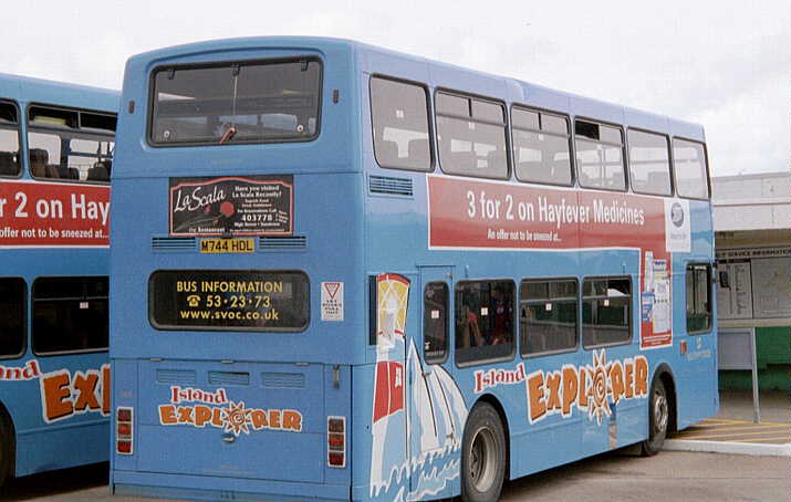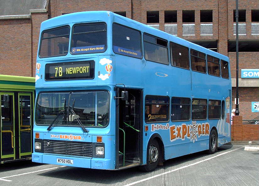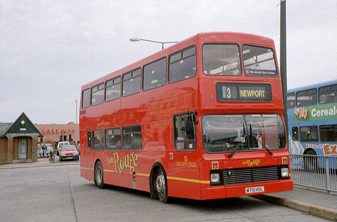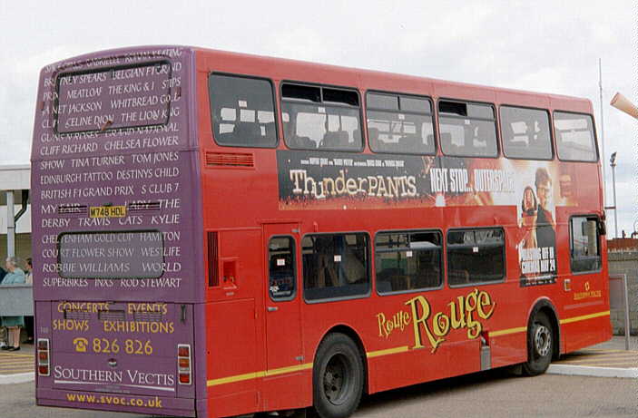 Island Explorer Blue livery in: In December 2001 M748HDL [748] was repainted into Route Rouge Red livery with a full rear-end advertisement for "Southern Vectis Holidays". [per Gavin Rowney] In early March 2002 M751HDL [751] had the Colorbus vinyls removed and it operated in a plain White with Red skirt livery for a short time. In April 2002 M751HDL [751], still in White base, received a Colorbus advertisement (in Red vinyls) for the "Isle of Wight Festival". [per Gavin Rowney] By 12 June 2002 M751HDL [751], still in White base, had the Red vinyls advertising the "Isle of Wight Festival" removed and replaced with large red cross vinyls (like a large St. George flag) to both the nearside and offside. [per Gavin Rowney] In October 2002 M751HDL [751] was repainted into Route Rouge Red livery. [per Gavin Rowney] Around August 2003 M751HDL [751] had the offside fixed glass window at the front of the upper-deck replaced with an opening vent type, as originally fitted. During