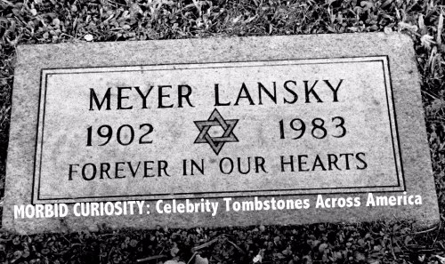 He spent his last days in Mount Sinai Hospital where he later died. The radiation treatment was burning him, it hurt his throat and he could barely speak. His appetite was gone. All they could do for him at this point was to give him drugs to manage his pain and to keep him comfortable. Meyer spent all of his time lying in bed, with tubes going in and out of his body. Though he was sedated with regular injections, he would pick away at the tubes, and on the morning of Friday, January 14th, he managed to pull out the tube that ran down his throat. His wife was there as the doctor and nurses fought to force the tube back down again. Despite his frail weak state, he fought them off, screaming. Later that evening he suffered a nose bleed which nurses could not stop. In the end, they could do no more than pack the nostril, and leave him lying there exhausted, but conscious enough to recognize his wife. He cried out to her, "Let me go!" Heavily sedated, Lansky fell into a deep sleep from which he never awoke. He died in the wee hours of Saturday, January 15, 1983. To the disappointment of the press there was no gangland funeral. There were no limousines, exotic wreaths, or broad shoulder ushers in black suits. His was, by mob standards, a bargain basement send off. He is buried in Mt. Nebo Cemetery, 5900 SW 77th Ave, Miami, Florida. If you want to visit take I-95 to SR836 (the Dolphin Expressway) to the Palmetto Expressway south towards, Coral Way, Merge onto the 826, take SW 56th Street/Miller Dr. exit. Keep right at fork in the ramp, merge on SW 56th Street, left on 77th Court then left into the cemetery. Go to the northwest corner of the cemetery. He is easily visible from the road. Look for names Schiff, Bloom, Wexler, and Applesteirn, if you see them you're in the right area. Like Meyer they are all upright tombstones, with gravemarkers in the ground.