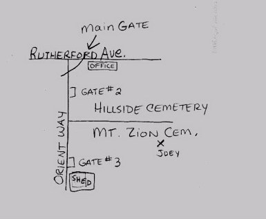 ![]() Mt. Zion, is part of the Hillside Cemetery as you will see in the drawing below. The main entrance is on the corner of of Rutherford Avenue and Orient Way. If you continue down Orient Way, enter via the 3rd gate (there is a maintenance shed nearby). Go straight in, the Jewish section is on your right hand side. Go about