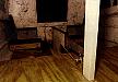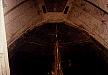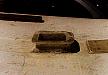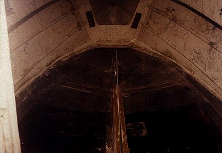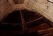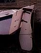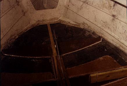 The interior (looking forward) of the fiberglass hull after the rotted wooden floor and frames have been stripped out. The dark sheets in the foreground are rotted 1/4-inch plywood that was bonded to the glass bottom for stiffening. That, too, was stripped out when Tom discovered water under the ply, and that it was bonded in only a few places. | |