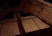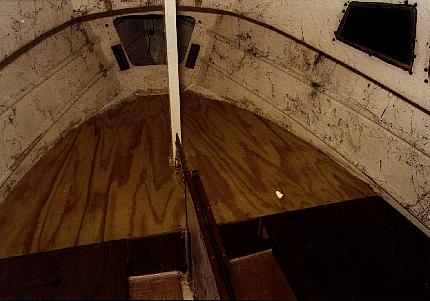 Looking forward: the bottom of this view shows the berth lids installed, and the foot well on either side of the centerboard trunk. The mast base stand in the center of the vee-berth area. | |