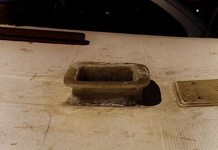 This flanged opening in the cabin top receives the mast, which is lowered until it steps on the vee-berth support. The flange around the orginal opening was cracked and broken, and much lower than this new version. | |