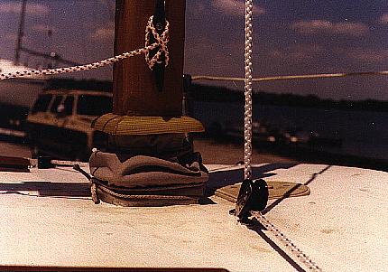 The refinished mast is shown stepped through the cabin-top opening, and a new boot which Tom's wife made is lashed in place as a weather seal. The turning block leads one of the halyards back to the cockpit. The line cleated on the mast is an adjustable lazy jack. | |