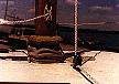 The lazy jack (a line from the masthead to the boom) which contains the mainsail when it is lowered is visible. Note the mainsheet rigged from the boom end. The "geezer" with the white hat and whiskers is Tom Grimes. | |