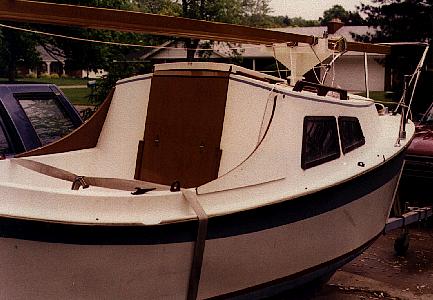 This view of Tom's boat shows the refinished spars (note the very nice spar rack set into the cabin-top mast opening), the cabin-top grab handle (now replaced with a three-hole model), and the new companionway hatch board, fashioned after the later model Potter hinged version. Tom also mounted a wheeled dolly on the trailer tongue for easier handling on pavement. | |
