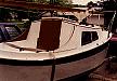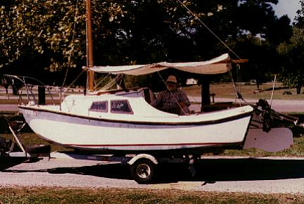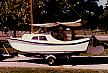 Tom Grimes gunter-model West Wight Potter on its trailer at the boat dealer, as he purchased it. This page of photos and captions shows how Tom transformed this early-model Potter into a "second-generation" model. The boat is gunter-rigged, but has the sliding hatch and the hinged vertical companionway hatch board of later boats, and hoists the larger 4-sided "pseudo gaff" mainsail with the full-length batten, rather than the original, smaller 3-sided mainsail. | |