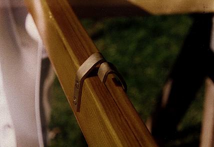 This homemade hook on the gunter spar is a reefing position hook for the mainsail halyard (an idea from Harry Gordon). A gunter rig is reefed by lowering the gunter spar with the sail attached. This hook allows the sail to be reset without retying the halyard: simply lower the spar, run the halyard under this hook, secure the reef grommet down, and rehoist the halyard to fly the reefed mainsail. | |