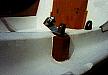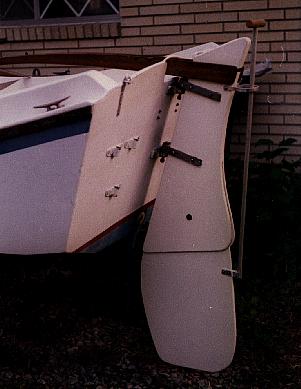 This rudder shows another Harry Gorden modification which has been adopted by many Potter owners. The vertical push-pull rod on the trailing edge raises and lowers the pivoted rubber blade, and shows at a glance whether the blade is up or down. This view also shows how the tiller is fitted to the rudder head on the early Gunter Potters. | |
