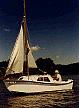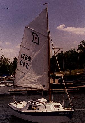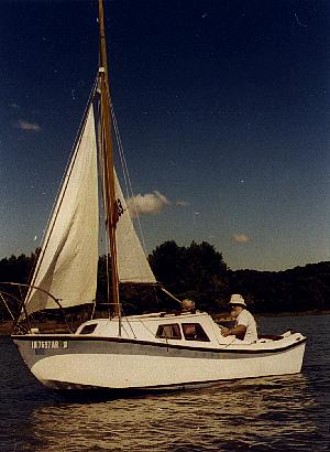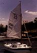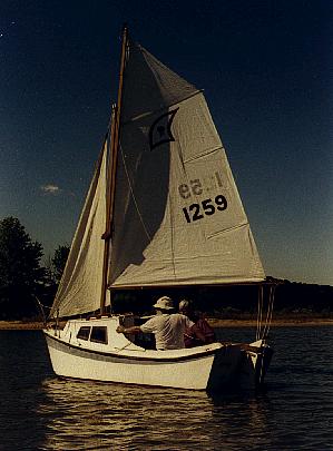 Sailing on a reservoir in central Indiana. Most of the rigging modifications show well in these views, as does the way that the gunter spar rides on the mast. | |