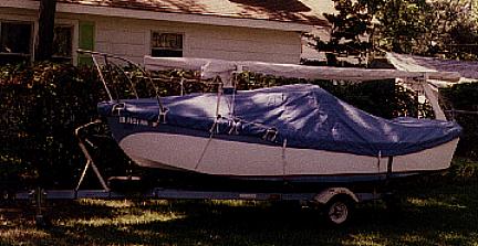 Tom shows a boom awning adapted for his Potter from another boat. It rests on the boom, which is supported by the lazy jack moved to the end of the boom. The awning ties off to existing cleats, the mast, and stanchions. | |