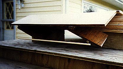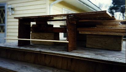 This small plywood assembly is a hinged platform that attaches to the berth cabinets, to provide support for the mattress pads. The fold-down legs are linked with the pivoted dowel. | |